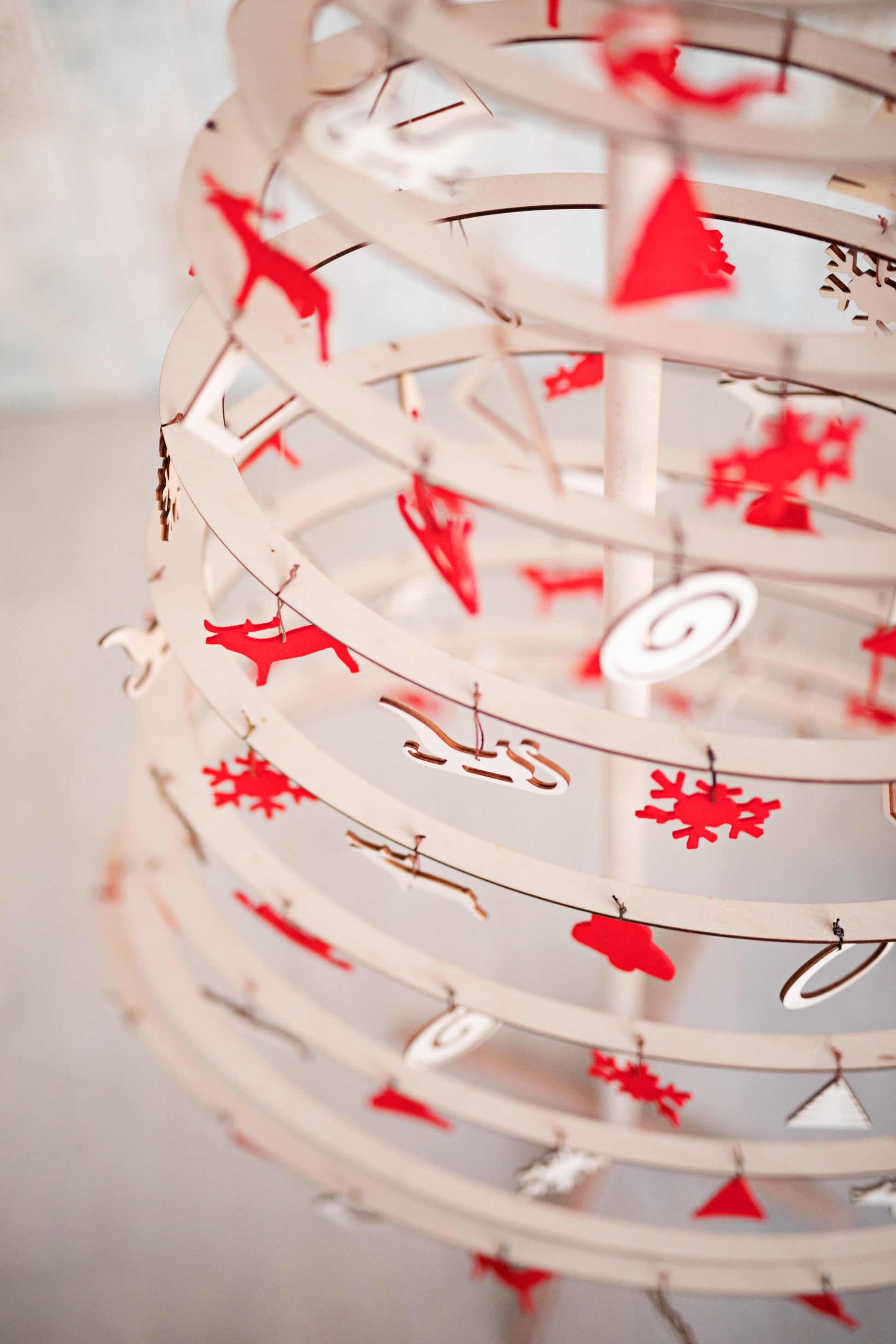 El set contiene 111 adornos de fieltro y madera, además de una estrella de madera para la punta del árbol. Los materiales naturales con formas dinámicas aportarán calidez y alegría a tu hogar, y el color rojo creará un ambiente festivo y animado.