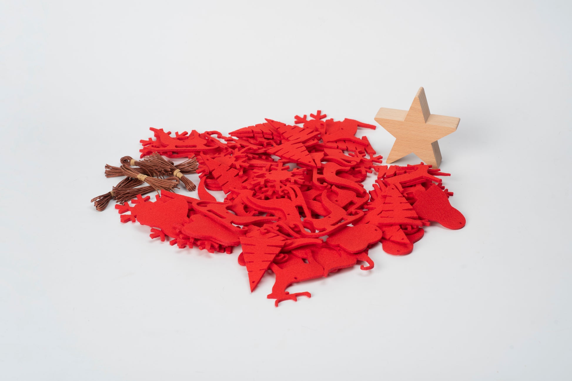 Un conjunto de adornos de fieltro rojo y una copa de estrella de madera para árboles de Navidad Spira de todos los tamaños. Lindas decoraciones crearán el ambiente festivo perfecto en casa. Lo único que falta es la cena de Navidad y las personas que más significan para ti.