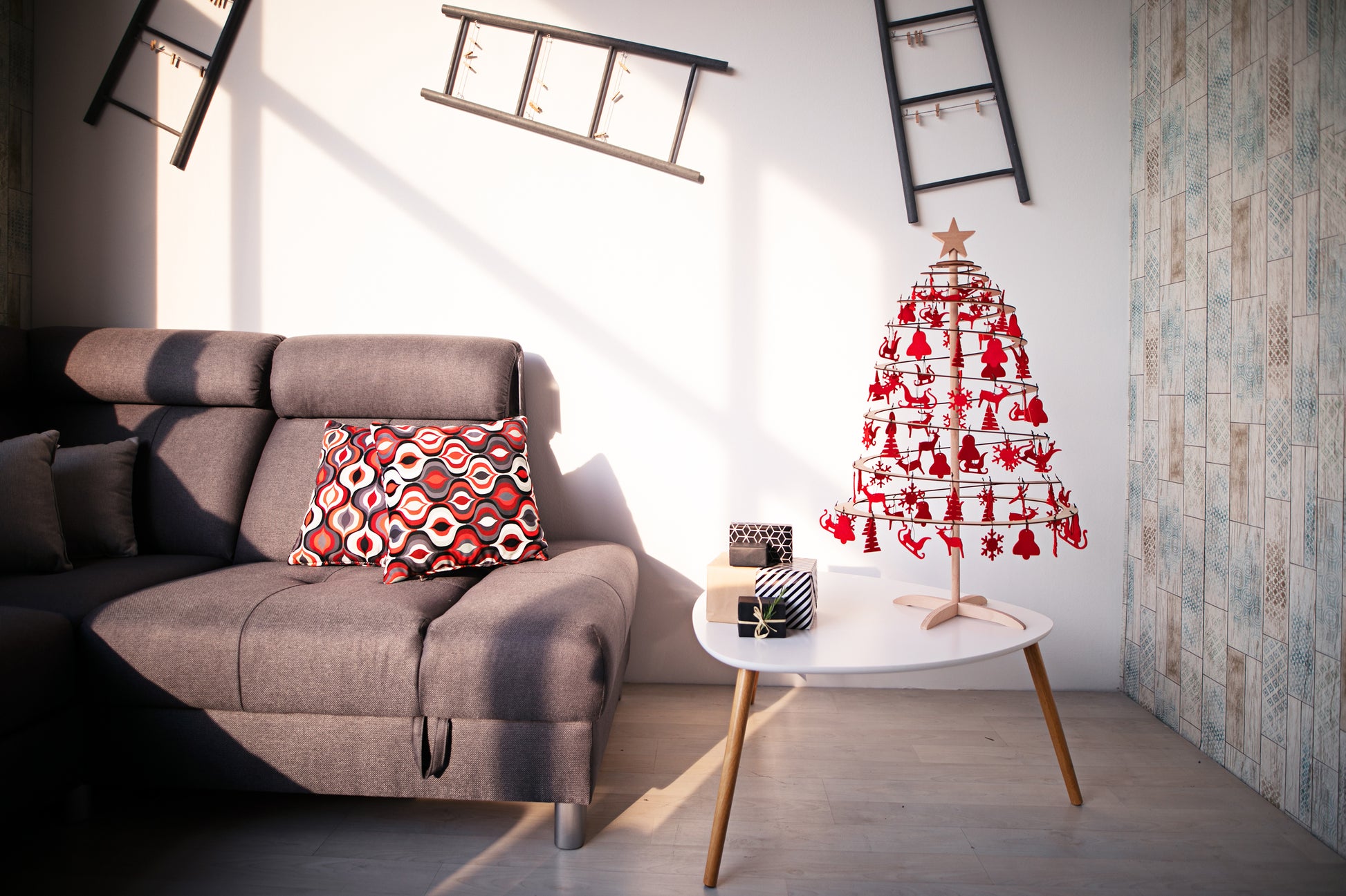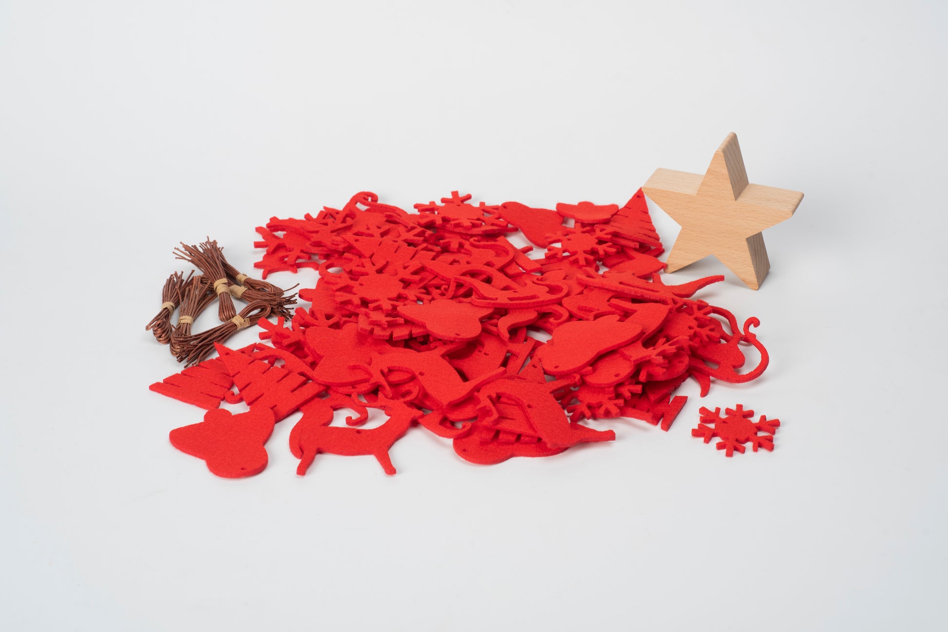 Un conjunto de adornos de fieltro rojo y una copa de estrella de madera para árboles de Navidad Spira de todos los tamaños. Lindas decoraciones crearán el ambiente festivo perfecto en casa. Lo único que falta es la cena de Navidad y las personas que más significan para ti