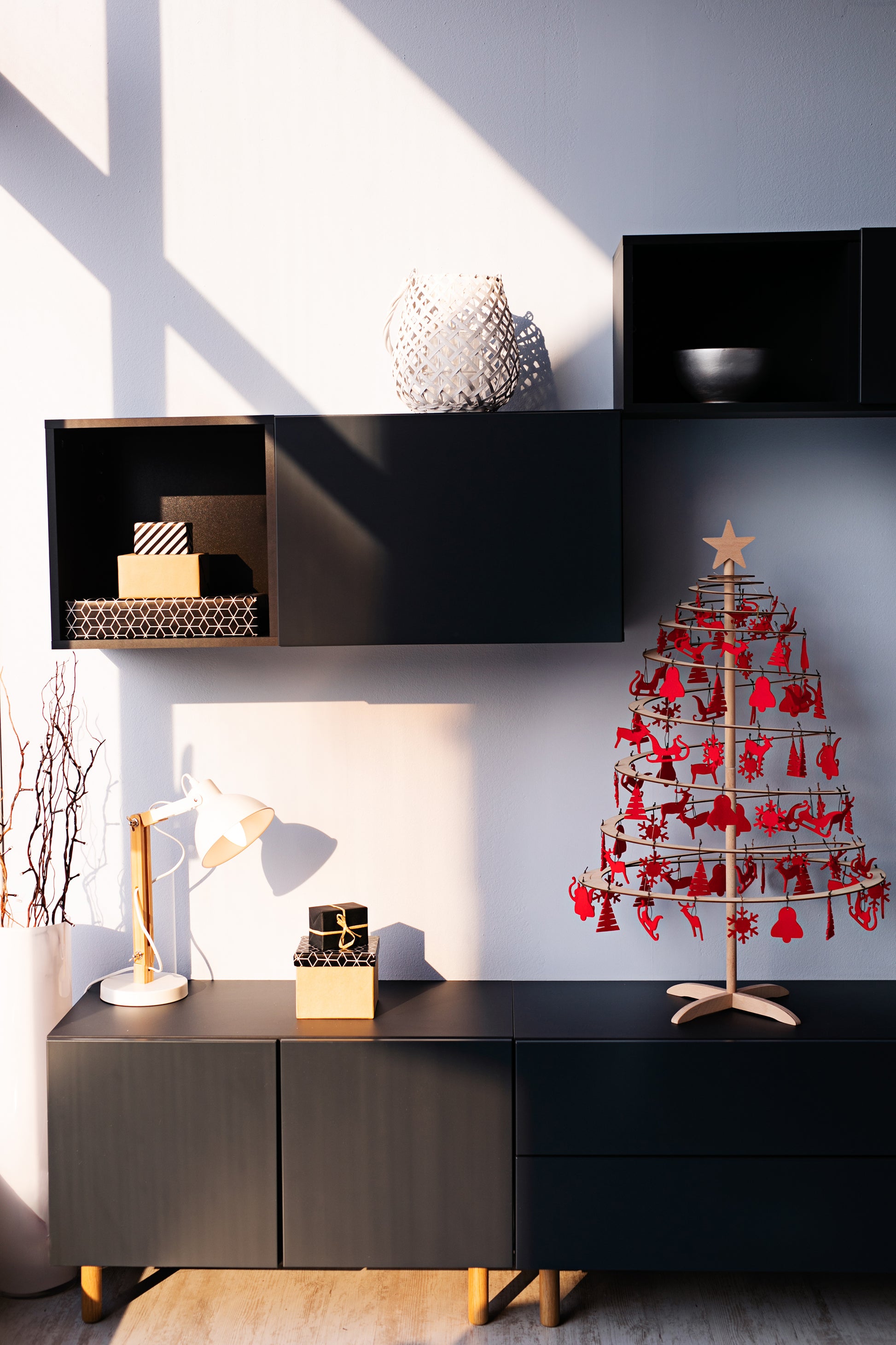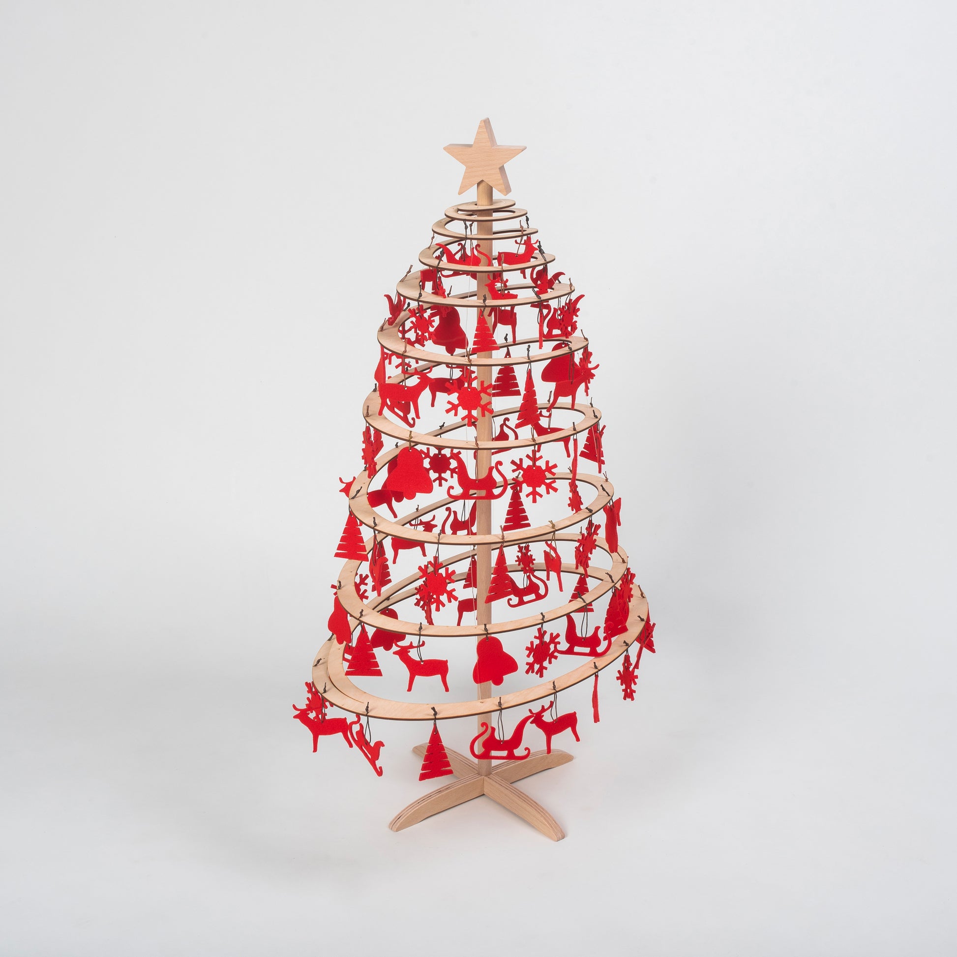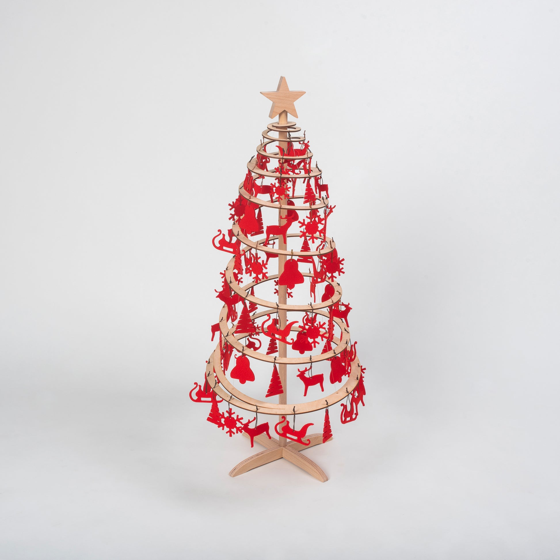 Una combinación de adornos de fieltro en 5 formas populares con temas navideños para su árbol Spira. Cada juego contiene una cierta cantidad de adornos de fieltro y una copa de estrella de madera. Se incluyen cordones para colgar.